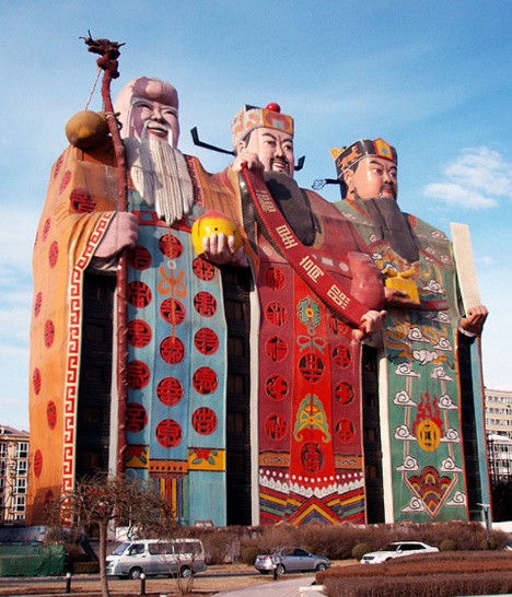 The buildings were designed as a representation of Fu Lu Shou, meaning good fortune, prosperity, and longevity. I prefer the words: tacky, inexpensive, and horrendous.